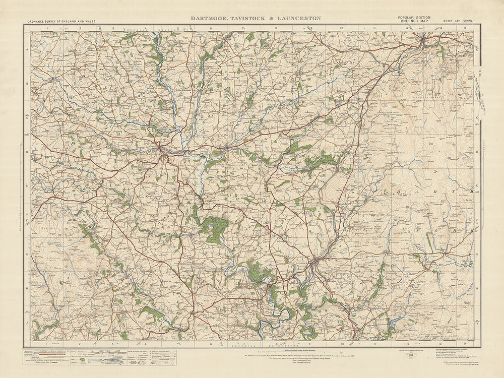 This vintage map, titled "Sheet 137 - Dartmoor, Tavistock & Launceston," is an authentic piece from Ordnance Survey's One-inch "Popular" edition of England and Wales, published in 1925. The map showcases the historic county of Dartmoor, Tavistock & Launceston, located in the southwestern part of England. It provides a fascinating glimpse into the region's past, allowing you to explore the towns, cities, and natural features that shaped the area during that time.