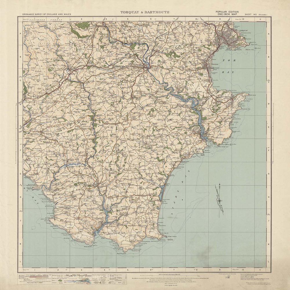 Old Ordnance Survey Map, Sheet 145: Torquay & Dartmouth, 1919-1926: Paignton, Totnes, Brixham, Dartmoor National Park, River Dart, and Start Bay
