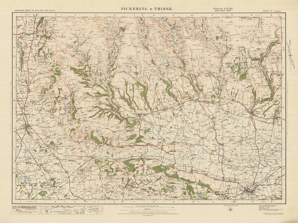This meticulously detailed and beautifully preserved map, titled "Sheet 22 - Pickering & Thirsk," is a part of the renowned Ordnance Survey's One-inch "Popular" edition, England and Wales, published in 1925. This map provides a fascinating glimpse into the past, offering a wealth of information about the region's geography, settlements, and landmarks.