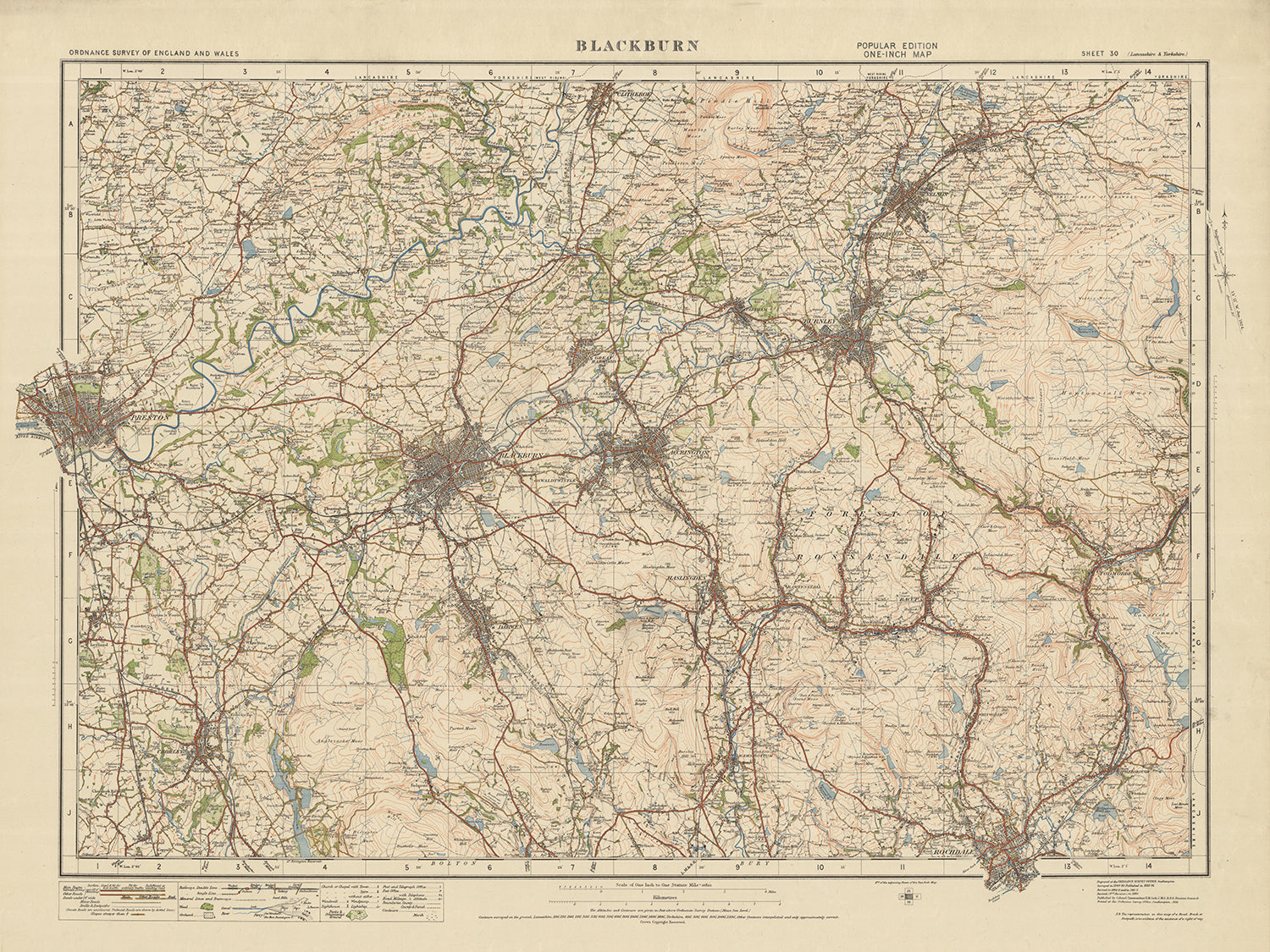 This Old Ordnance Survey Map, Sheet 30 - Blackburn, 1925, is a fascinating historical document that provides a glimpse into the past of England and Wales. Published in 1925, this map is part of the One-inch "Popular" edition by Ordnance Survey. It covers an area that includes several notable towns and cities, such as Preston, Burnley, Clitheroe, Accrington, and Chorley, in addition to Blackburn itself.