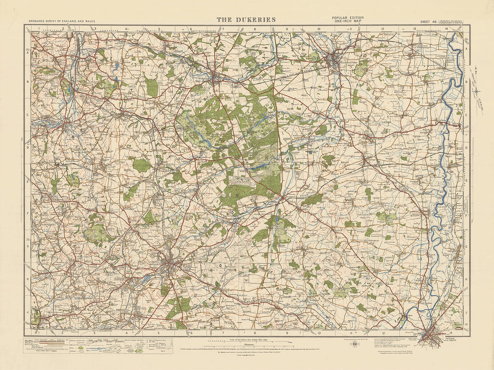 Explore the history and geography of the region with this meticulously detailed Old Ordnance Survey Map, Sheet 46 - The Dukeries, 1925. Gain insights into the past and uncover the fascinating stories behind the towns, cities, and natural features that shaped this historic area.