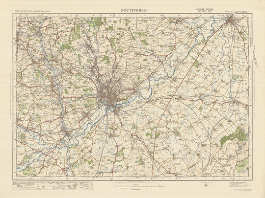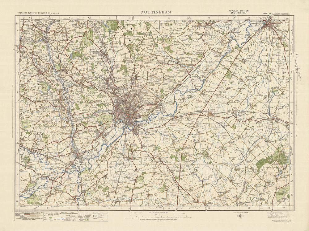 The "Old Ordnance Survey Map, Sheet 54 - Nottingham, 1925" is a fascinating piece of cartographic history that provides a detailed snapshot of Nottingham and its surrounding areas in the early 20th century. This map, part of the One-inch "Popular" edition for England and Wales, offers a wealth of information about the towns, cities, and interesting features that were present at the time.