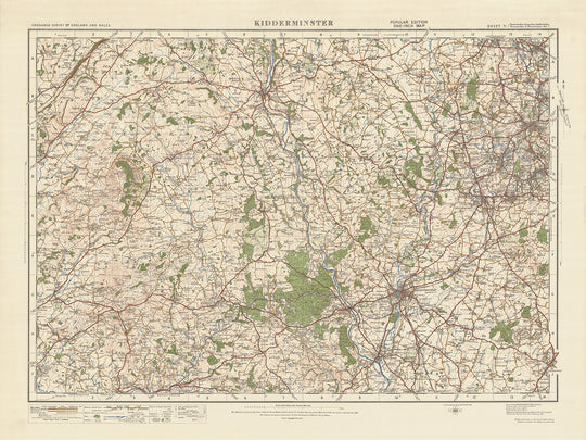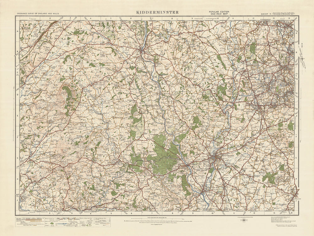 This vintage map, titled "Sheet 71 - Kidderminster," is a part of the renowned Ordnance Survey's One-inch "Popular" edition of England and Wales, published in 1925. The map showcases the towns, cities, and fascinating features of the region, including Dudley, Stourbridge, Stourport-on-Severn, Bridgnorth, and the Wyre Forest National Nature Reserve.