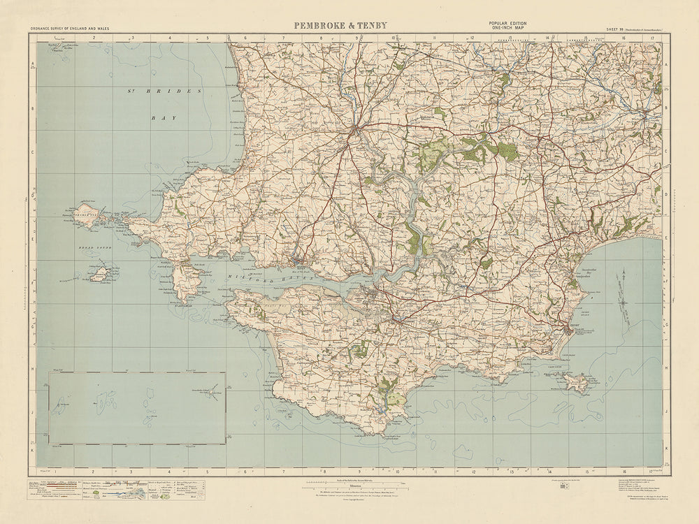 This meticulously crafted reproduction of the Ordnance Survey's One-inch "Popular" edition map, Sheet 99 - Pembroke & Tenby, published in 1925, offers a captivating glimpse into the past. The map showcases the historic county of Pembroke & Tenby, located in Wales, United Kingdom. Featuring a wealth of towns, cities, and fascinating landmarks, this map is a remarkable piece of cartographic history that will add a touch of nostalgia and intrigue to any wall.