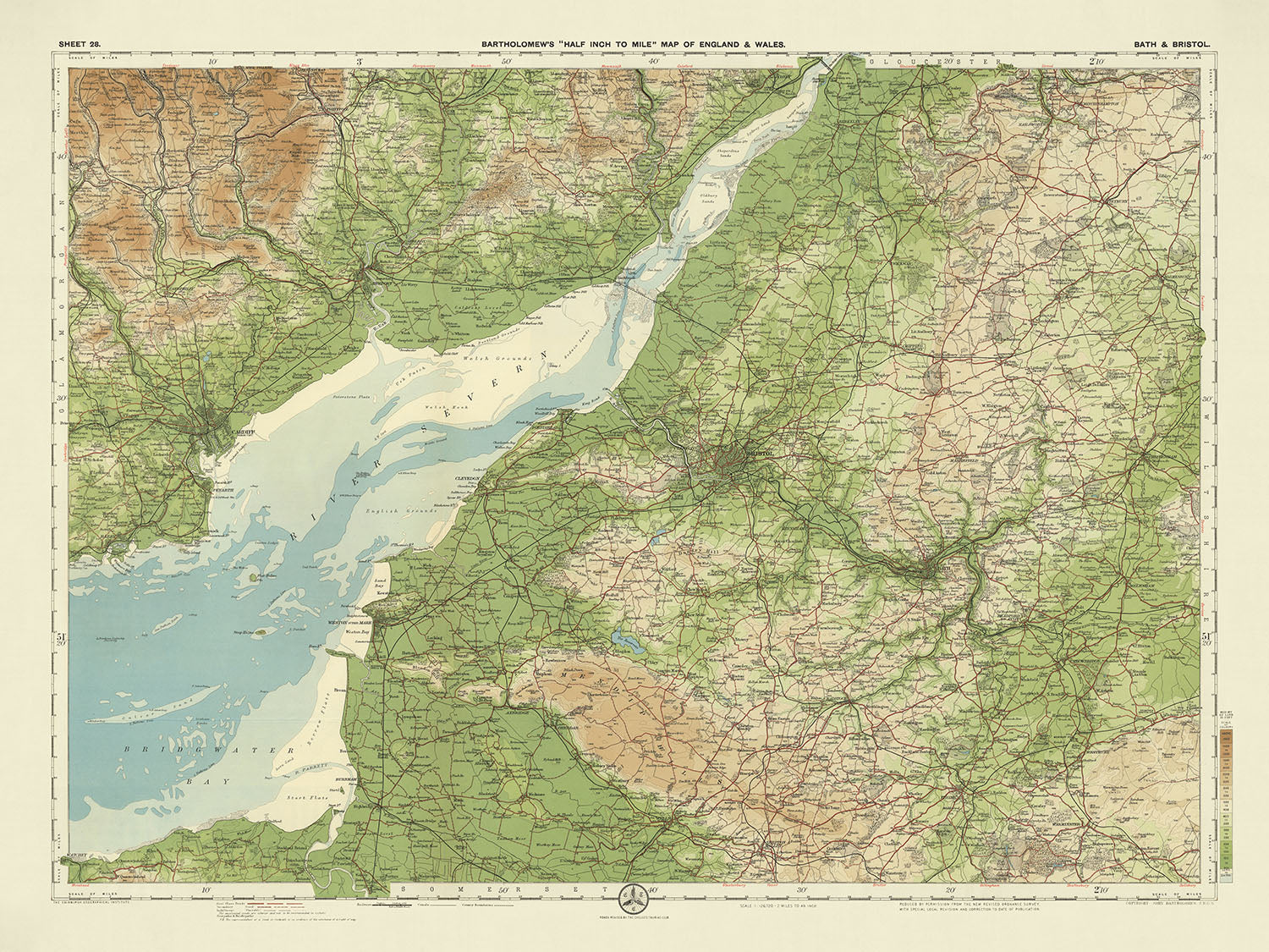 Immerse yourself in the rich historical tapestry of early 20th-century England with the exquisite "Sheet 28 - Bath & Bristol" map, crafted by the illustrious J.G. Bartholomew in 1901. This masterpiece, part of Bartholomew's renowned Half-Inch to the Mile series, offers a vivid portrayal of the Bath and Bristol regions, meticulously detailed and beautifully colored. Known for his innovative cartographic techniques, Bartholomew's work set a new standard in map design, making this piece a prized possession for any collector or history enthusiast.