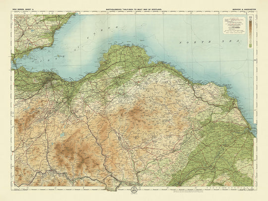 Step into the rich tapestry of early 20th-century cartography with "Sheet 9 - Berwick & Haddington," a masterful creation by the renowned Scottish cartographer JG Bartholomew. This map, crafted in 1901, is a testament to Bartholomew's unparalleled skill and innovative approach to mapping. Known for his detailed and aesthetically pleasing maps, Bartholomew's work was highly regarded by tourists and cyclists alike. This particular map stands out for its meticulous depiction of the political and physical landscape of Berwickshire and Haddingtonshire, regions steeped in history and natural beauty.