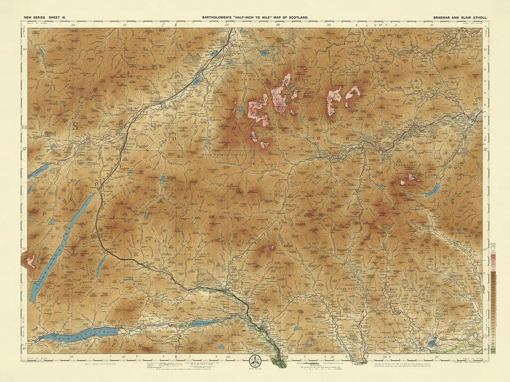 Step into the captivating world of early 20th-century cartography with "Sheet 16 - Braemar and Blair Atholl," an exquisite creation by the renowned Scottish cartographer J.G. Bartholomew. Crafted in 1901, this map is a testament to Bartholomew's mastery in blending artistic elegance with geographical precision. Known for his innovative use of color to represent landscape relief, Bartholomew's work on this map showcases a subtle gradation of hues to depict the varying elevations of the Scottish Highlands, offering a visually stunning and informative representation of the region.
