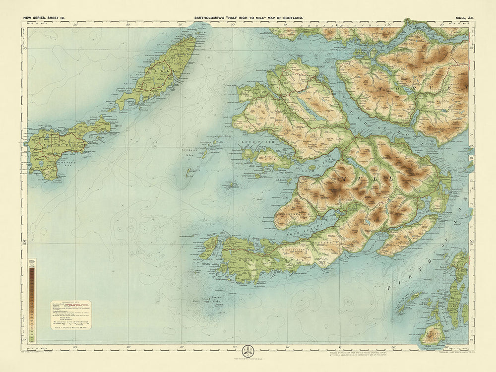 Sheet 10 - Mull, crafted by the esteemed cartographer JG Bartholomew in 1901, is a masterpiece of early 20th-century mapmaking. Bartholomew, known for his innovative and high-quality maps, created this detailed half-inch to the mile scale map to cater to the burgeoning interest in cycling and tourism. The map's original title reflects its focus on the Isle of Mull and its surroundings, capturing the essence of this rugged and picturesque region of Scotland. The map's clarity and precision, combined with its use of color to represent terrain, make it not only a practical tool for travelers but also a work of art.