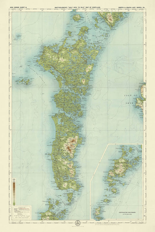 Bartholomew's distinctive style is evident in the map's design, which uses a subtle gradation of color bands to represent landscape relief. This innovative technique allows viewers to appreciate the varied topography of North and South Uist, from the rugged peaks of Hecla and Beinn Mhor to the serene waters of Lochmaddy and Lochboisdale. The map's portrait orientation further enhances its visual appeal, offering a clear and attractive representation of the islands' geography.