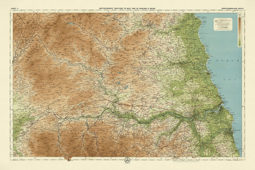 Bartholomew's expertise shines through in this map, which is based on a reduced Ordnance Survey map from the same period. His meticulous attention to detail is evident in the clear delineation of political boundaries and the intricate depiction of physical features. The map covers a landscape that stretches 36 miles from north to south and 52 miles from west to east, encompassing a diverse array of terrains and landmarks. From the rolling Cheviot Hills to the serene North Sea coastline, every inch of this map tells a story of the land's rich heritage and natural splendor.