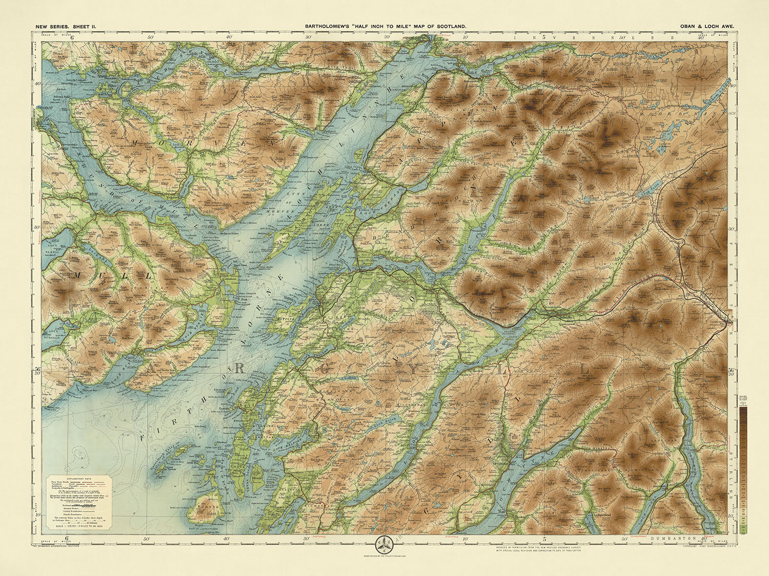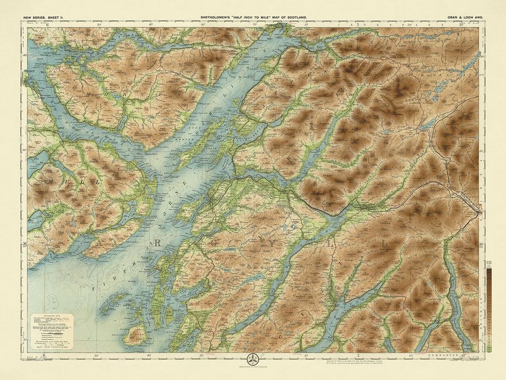 Sheet 11 - Oban & Loch Awe, crafted by the esteemed JG Bartholomew in 1901, is a captivating glimpse into the western Highlands of Scotland at the turn of the 20th century. This map, part of Bartholomew's renowned Half-Inch to the Mile series, was a favourite among cyclists and tourists, celebrated for its clarity and vibrant use of colour. Bartholomew's innovative technique of using gradations of colour to depict landscape relief adds a unique visual appeal, making the map both a functional navigational tool and a work of art. The map's meticulous detail and aesthetic beauty reflect Bartholomew's reputation as one of Scotland's foremost cartographers.