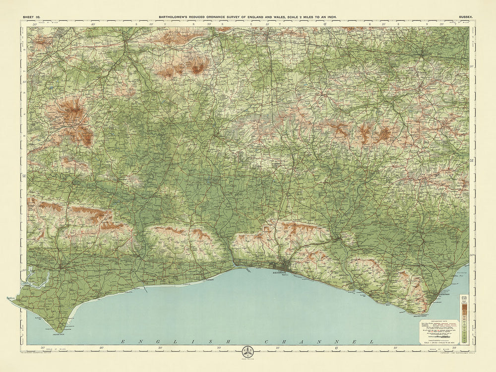 The design of this map is particularly noteworthy for its innovative use of color to represent landscape relief. Different layers of color bands subtly gradate to show land at various heights, providing a vivid and informative representation of the terrain. The South Downs, with their rolling chalk hills, are prominently featured, along with other natural landmarks such as Beachy Head's iconic chalk cliffs and the lush expanse of Ashdown Forest. The map's aesthetic appeal is matched by its functional design, making it a prized possession for both collectors and history enthusiasts.