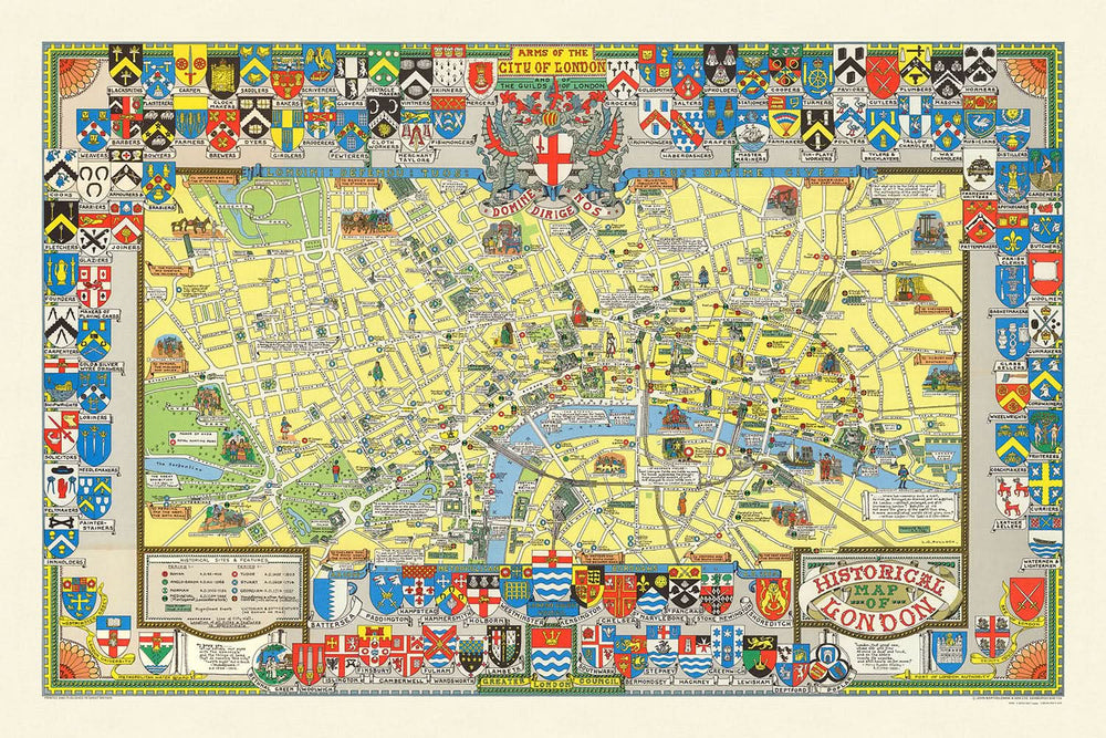 Old Pictorial Map of London by Bullock, 1965: Coats of Arms, Landmarks, Westminster, City