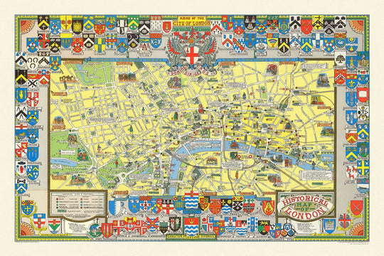 This map is a treasure trove of London's historical landmarks, featuring illustrations of the Tower of London, St. Paul's Cathedral, and Westminster Abbey. Each landmark is meticulously depicted, providing a visual journey through the city's architectural marvels. These iconic structures are not only significant in their own right but also serve as enduring symbols of London's storied past, making this map a must-have for history enthusiasts and collectors alike.
