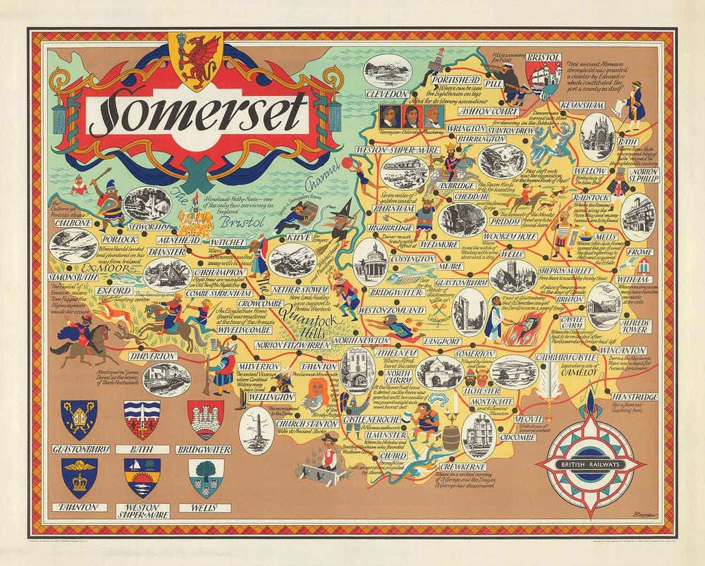 Beautiful, highly detailed illustrations adorn the map, showing famous landmarks, towns, and important bits of history. The coats of arms of Glastonbury, Bath, Bridgwater, Taunton, Weston-super-Mare and Wells are also shown - along with a lovely 1950s British Railway compass rose logo.