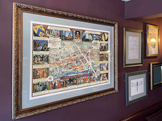 The whole map focuses on Shakespeare's life in the town - where he lived, where he retired, illustrations of his children, friends and schoolmaster, and other funny/interesting anecdotes.