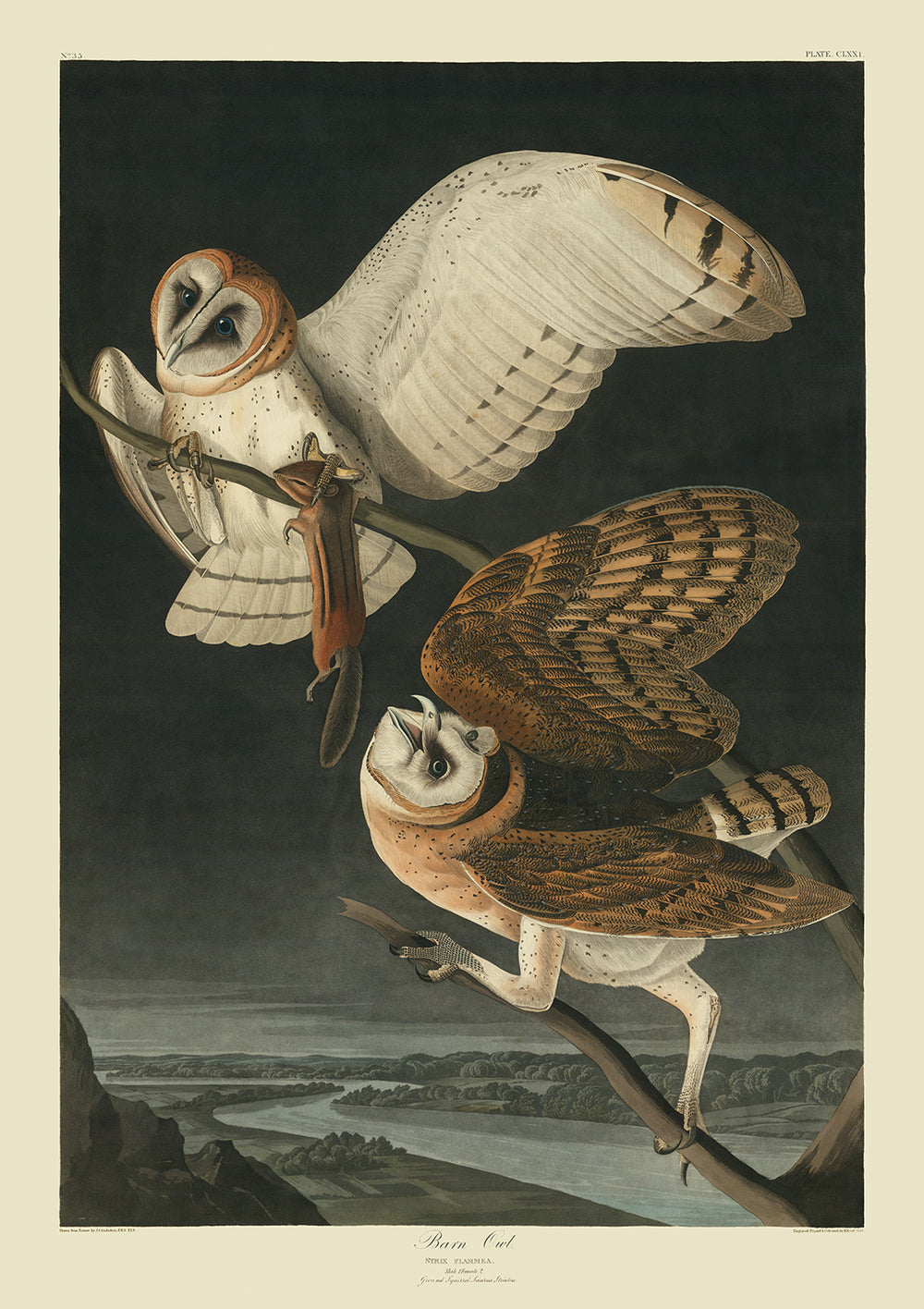 This particular piece is especially notable for being one of only three night scenes within the entire collection, the others being Plate CXXI (Snowy Owl) and Plate CCCXI (American White Pelican). Audubon masterfully captures the predatory nature of the Barn Owl, with the upper bird’s wings majestically flared as it clutches a chipmunk. The intricate depiction of this predator-prey relationship, set against a dramatic nocturnal landscape, adds a layer of fascinating allure to this art piece.