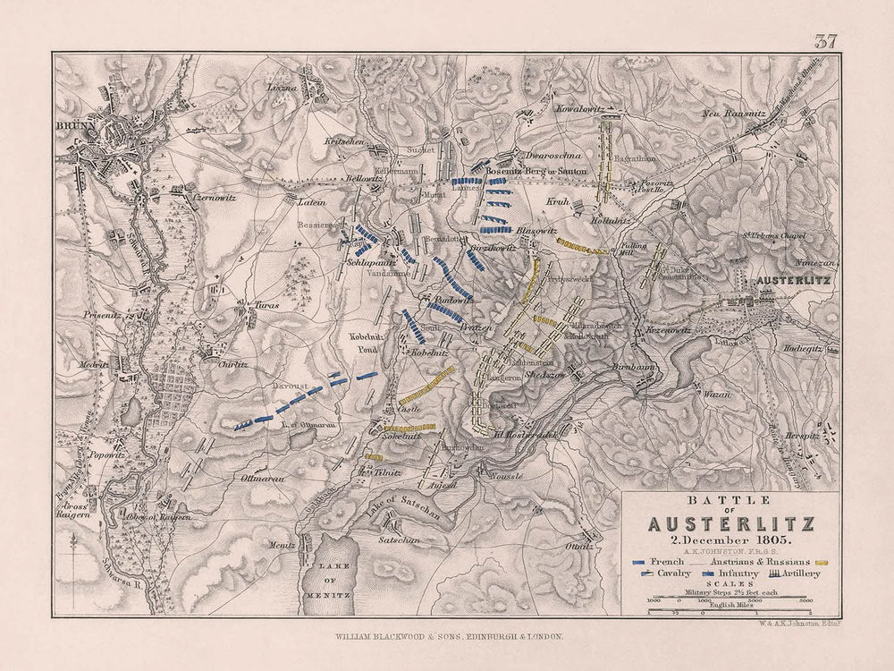William and Alexander Keith Johnston, celebrated for their cartographic excellence, were commissioned to engrave this map under the supervision of Sir Archibald Alison for his "History of Europe." This atlas chapter not only presents a bird's-eye view of military history but also showcases Johnston's adept skill with vivid, hand-colored notations of the intricate positions of French, Russian, and Austrian forces. Hachures elegantly indicate the terrain's relief, contributing to its utility and aesthetic charm.