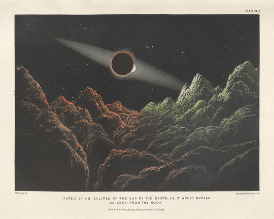 James Nasmyth's "Plate XXII Aspect Of An Eclipse Of The Sun By The Earth, As It Would Appear As Seen From The Moon" is a captivating antique colour lithograph originally published in 1874. This artwork offers a unique astronomical perspective, imaginatively depicting an eclipse of the sun by the Earth as viewed from the lunar surface. Nasmyth's meticulous craftsmanship combines science, art, and innovative photographic techniques, resulting in a dramatic and visually arresting image that continues to fascinate both astronomers and art enthusiasts alike.