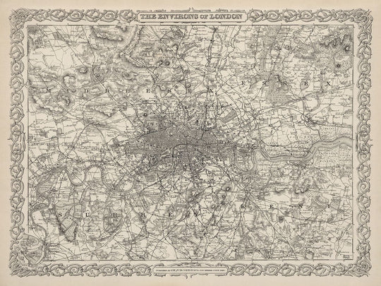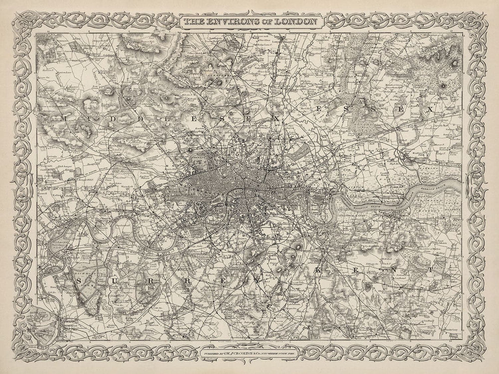The Environs of London by G.W. Colton in 1886 shows how large London had become at the peak of the British Empire. Most of what we now consider the inner city boroughs are in place - but the suburbs are still fields and forests.