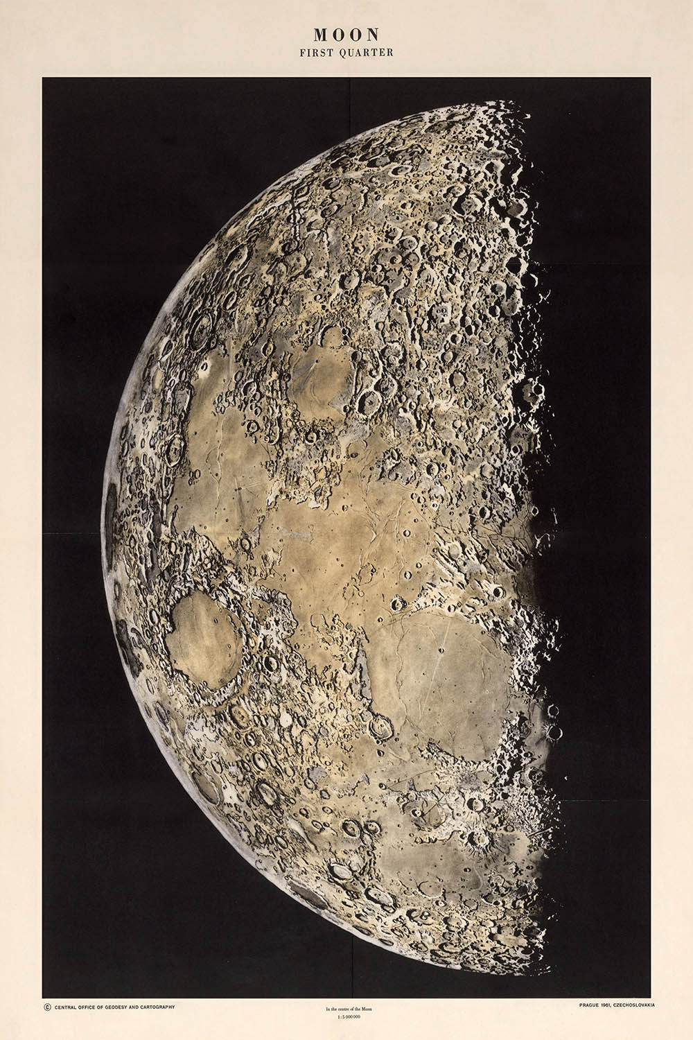 The "First Quarter of the Moon," originally titled "Moon: First quarter," is a remarkable antique colour lithograph created by Josef Klepešta in 1961. This artwork captures a detailed map of the moon during its first quarter, featuring its prominent craters and lunar mountains, based on photographs taken at the Lick Observatory in California and other international observatories.