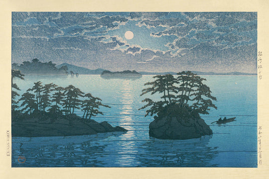 Futago Island - Moonlight At Matsushima, crafted by the renowned artist Hasui Kawase in 1935, is a stunning woodblock print that captures the mesmerizing interplay of moonlight and coastal landscape. Kawase, a prominent figure in the shin-hanga ("new prints") movement in Japan, is celebrated for reviving traditional ukiyo-e techniques while infusing them with modern realism and emotion. This artwork embodies Kawase’s deep appreciation and talent for depicting Japanese landscapes, creating a serene scene imbued with tranquility and beauty.