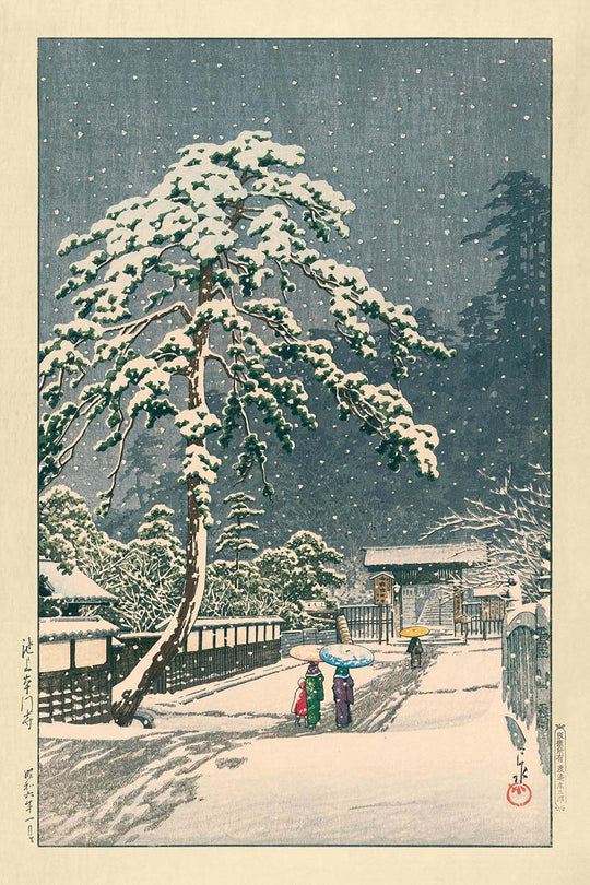 Hasui Kawase was a pivotal figure in the resurgence of Japanese traditional woodblock prints in the early 20th century, known for his evocative landscapes. This piece is particularly notable for its masterful depiction of seasonal ambiance and skillful technical execution. The original artwork, a charming snapshot of quiet grace, deftly employs a palette centered on whites and blues, infusing the scene with a calming, tranquil allure—a testament to Kawase's genius.