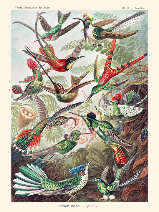 Ernst Haeckel, renowned for his contributions to biology and naturalism, was a distinguished German scientist and artist. His work bridged the gap between art and science, making complex biological concepts accessible and visually compelling. The "Hummingbirds" illustration is part of Haeckel's larger body of work, Art Forms in Nature, which has been celebrated for its aesthetic beauty and scientific precision.