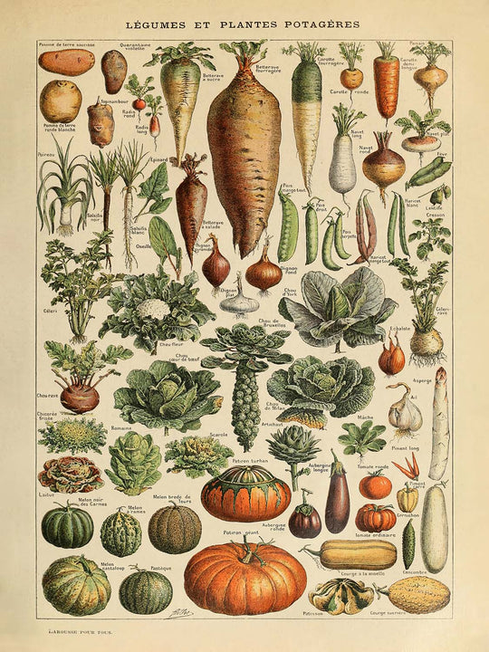 Celebrating all the beauty and bounty of the kitchen garden, "Legumes" is an enchanting botanical illustration by renowned French artist Adolphe Millot, first published in 1890. Drawn for the acclaimed "Le Larousse pour tous," Millot’s detailed tableau features an exquisite variety of legume plants and vegetables, each labelled pristine in the elegant French script of Belle Époque Paris. His illustration evokes a sense of Victorian curiosity, scientific wonder, and classic artistry, blending educational purpose with exceptional decorative flair.