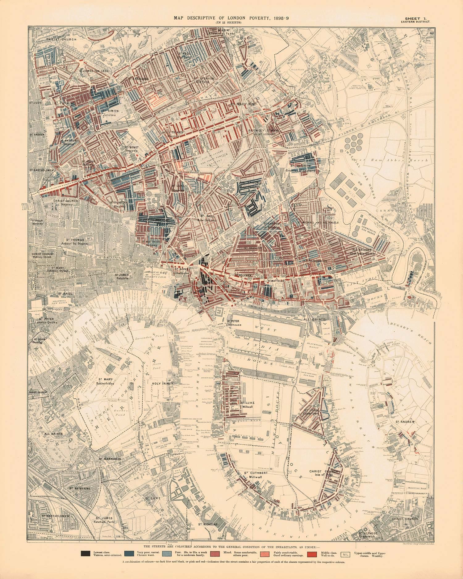 Map of London Poverty 1898-9, Eastern District, by Charles Booth: Isle of Dogs, Surrey Quays, West India, Canary Wharf
