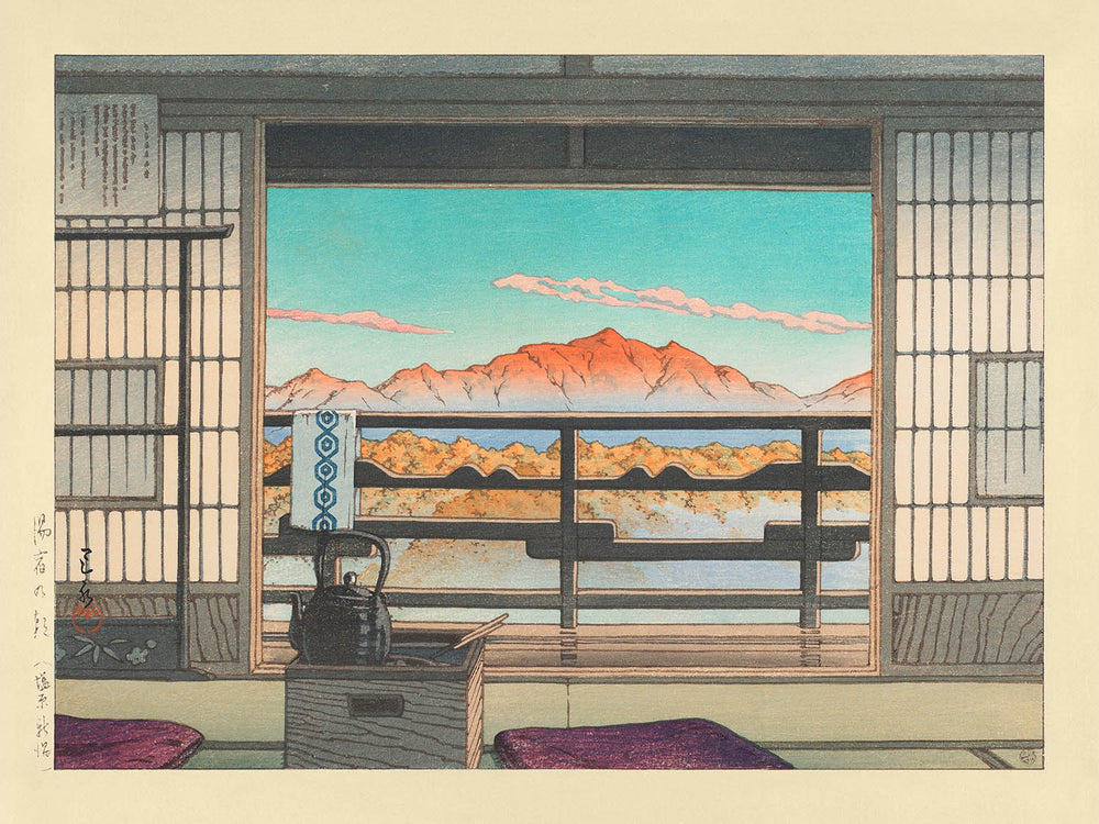 Kawase’s intricate woodblock technique is clearly evident in the fine detailing of the shoji paper walls and wooden railings, while careful layering of hues and delicately modulated shadows give the scene remarkable depth and a lingering mood, making this an exquisite addition to any art collection. This print endlessly captivates—ideal for lovers of Japanese art, collectors of classical landscapes, or anyone wishing to evoke calm and beauty within their personal space.
