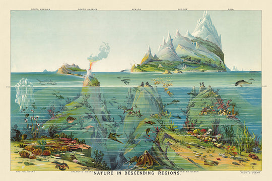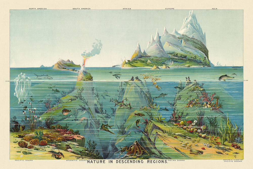Marvel at the captivating artwork "Nature in Descending Regions," created in 1893 by the distinguished Levi Walter Yaggy. This antique colour lithograph stands as a testament to Yaggy's brilliance in educational art and his pioneering use of chromolithography. Each intricate detail captures the vibrant world of natural phenomena, designed to inspire and educate 19th-century students.