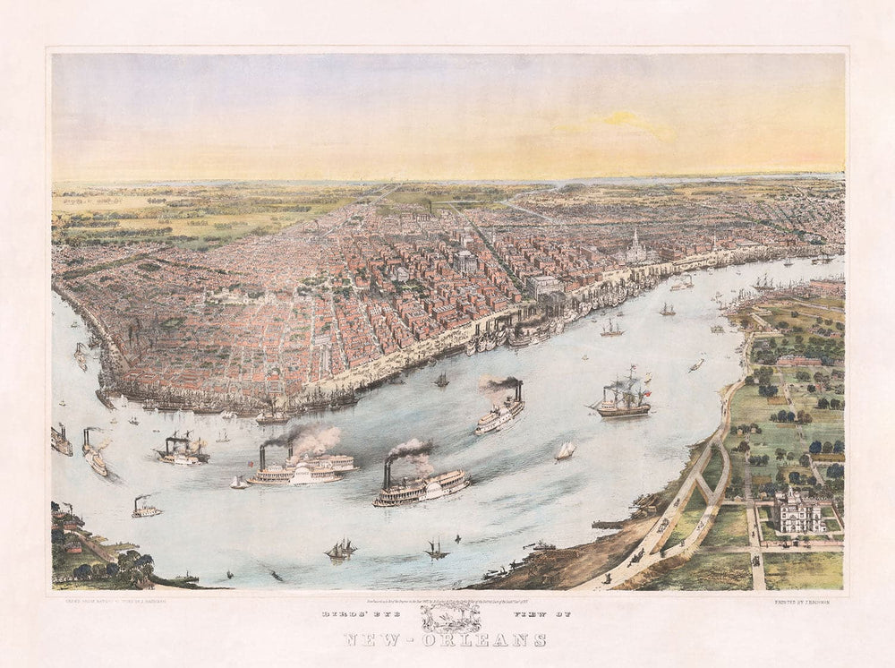 Old Birds Eye Map of New Orleans in 1851: French Quarter, CBD, Treme, Mississippi River, St Louis Cathedral, Jackson Square