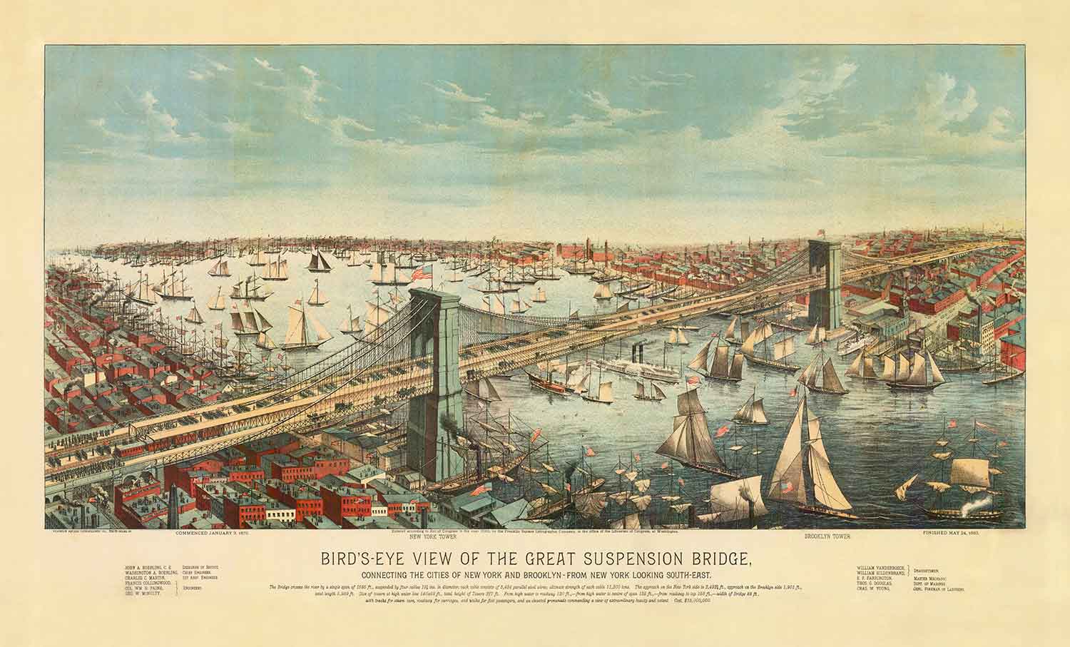 A large beautiful pictorial map of the Brooklyn Bridge - or the Great Suspension Bridge - on the day that it was opened. It was considered a fantastic engineering accomplishment in the 19th century and was the first suspension bridge that used steel for its cable wires!
