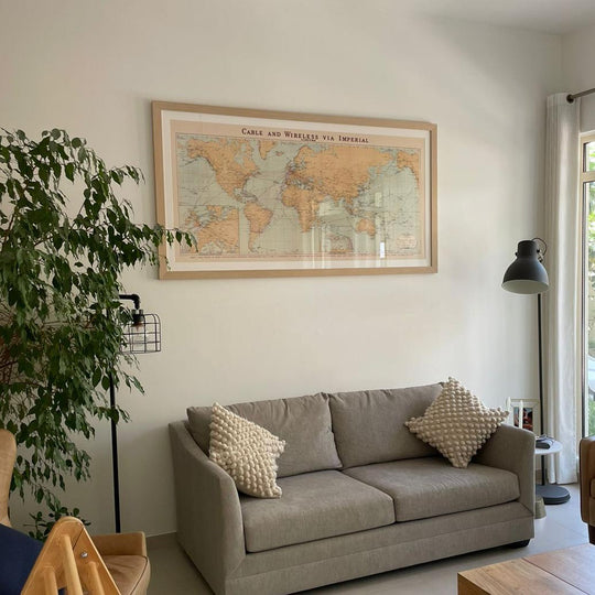 This map is an unusual size - it's extremely wide - and would make a fantastic statement piece above a sofa, table, mantelpiece or staircase. The three smaller sizes (18x9, 24x11 and 36x17 inches) all come with white edges that help with framing, or can be easily snipped off if necessary. The larger sizes, and all framed maps, are all printed and pre-cut perfectly to size and look just like the listing images.
