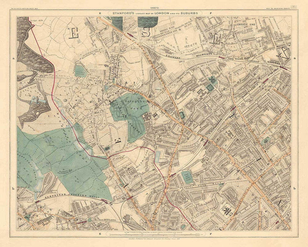 The map was originally published in 24 sheets. Altogether the map would've measured about 2 metres wide (78 inches). This here is sheet 2, which focuses on Highgate and the north London boroughs of Camden, Haringey and Islington.