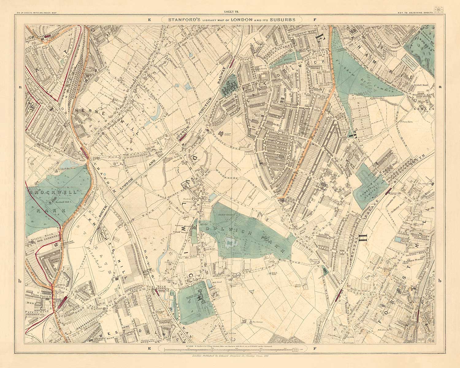 The map was originally published in 24 sheets. Altogether the map would've measured about 2 metres wide (78 inches). This here is sheet 19, a beautiful map that shows one of my favourite towns in south London: Peckham Rye, East Dulwich, Dulwich, West Dulwich, Forest Hill AND Herne Hill! (I know, amazing) in the London boroughs of Lambeth and Southwark.