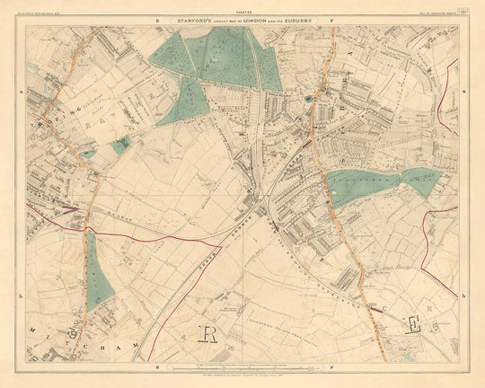 The map was originally published in 24 sheets. Altogether the map would've measured about 2 metres wide (78 inches). This here is sheet 22, which focuses on the towns of Tooting and Streatham in the south London boroughs of Wandsworth and Lambeth.