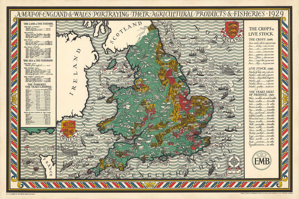 This wonderful old map of the Agriculture and Fisheries of England and Wales was originally published in 1928. It was created by Macdonald Gill.