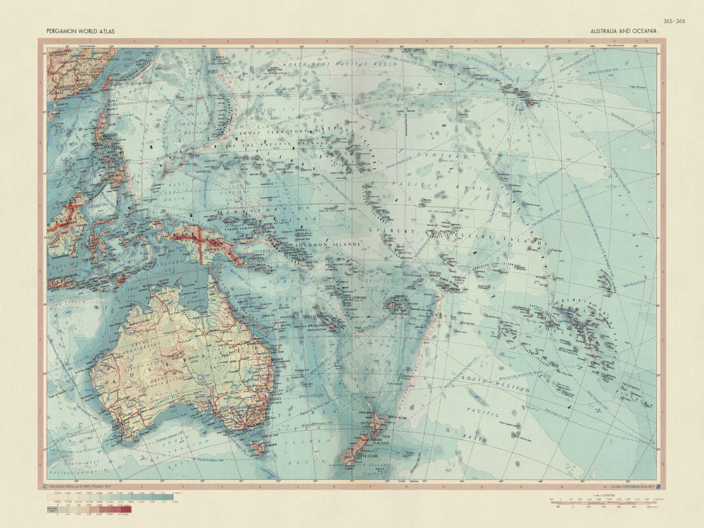 Immerse yourself in the intricate details of the 'Australia and Oceania' map, a stunning testament to the cartographic prowess of the Polish Army Topography Service, first brought to life in 1967. This World Map, a detailed political and physical representation, captures the vast expanses of the Pacific Ocean and the land masses that punctuate its blue expanse. The map's subjects extend beyond the titular Australia and Oceania, reaching as far as Hawaii in the northeast, Polynesia in the southeast, Hong Kong in the northwest, and Borneo in the west. This expansive coverage provides a comprehensive view of the Pacific region, allowing the viewer to appreciate the scale and diversity of these distant lands.