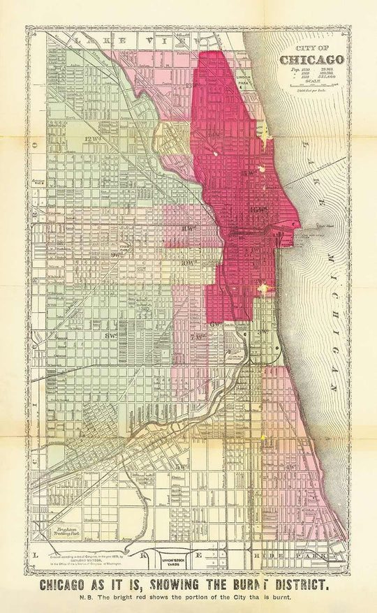A fantastic, historically important map of Chicago, published in 1871 shortly after the Great Fire, which burned for 2 days and wiped out a huge portion of the city.