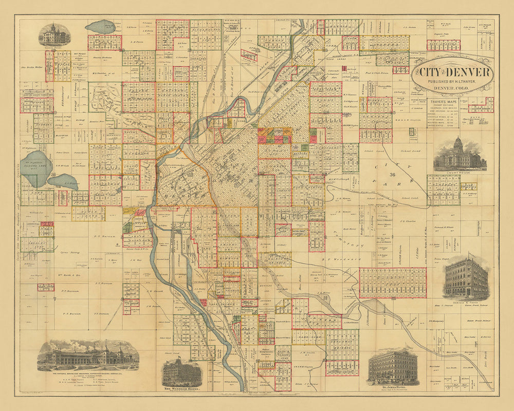H.L. Thayer's craftsmanship and attention to detail are evident throughout this map. His ability to capture the intricate layout of Denver, along with its significant landmarks and infrastructure, makes this map a valuable historical artifact. The "City of Denver" map is not just a tool for navigation but a rich tapestry of the city's history, offering a unique perspective on its growth and development. For collectors and history enthusiasts, this map is a treasure trove of information and a testament to Denver's vibrant past.