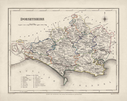 Own a piece of history with this Old Map of Dorset by Samuel Lewis, 1844. Immerse yourself in the rich heritage of the county and marvel at the intricate details that bring this historical map to life.