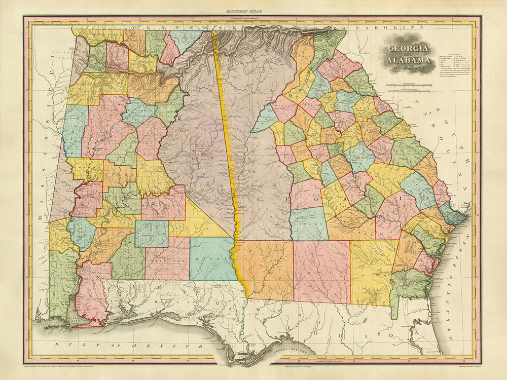 Experience history come alive with this exquisite reproduction of H. S. Tanner's 1820 map of Georgia and Alabama. The map provides a vivid window into the Southern United States' early 19th-century development, displaying both the grandeur of its natural features and the burgeoning communities that would eventually become important urban centers. This remarkable map is a testament to Tanner's cartographic artistry and an invaluable piece of historical documentation.