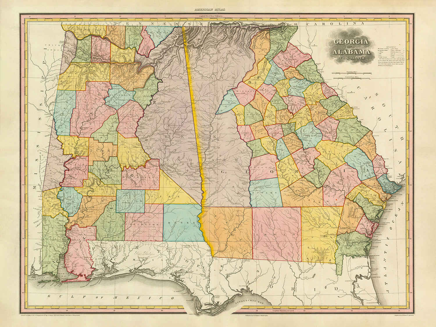 Old Map of Georgia and Alabama by H. S. Tanner, 1820: Atlanta, Savannah, Augusta, Columbus (GA), and Montgomery