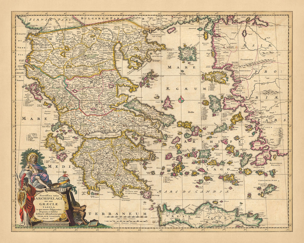 Visscher II, hailing from a lineage of renowned Dutch mapmakers, has captured the historical and geographical essence of the region with precision and artistry. This map is not just a navigational tool, but a window into the past, a testament to the rich history and diverse geography of Greece and its surrounding regions. Owning this map is akin to owning a piece of history, making it a must-have for collectors and history enthusiasts alike.