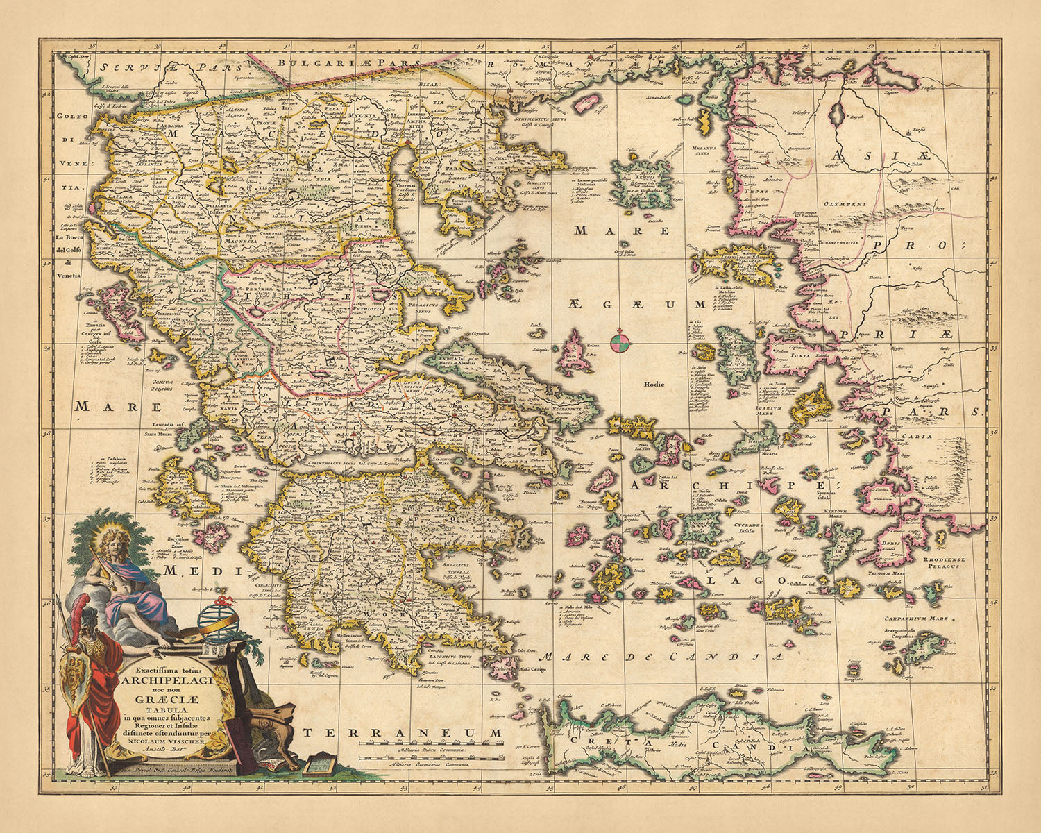 Old Map of Greece, Turkey & Aegean by Visscher, 1690: Athens, Crete, Saronic Islands, Cyclades, Dodecanese