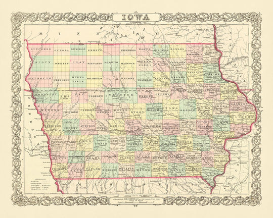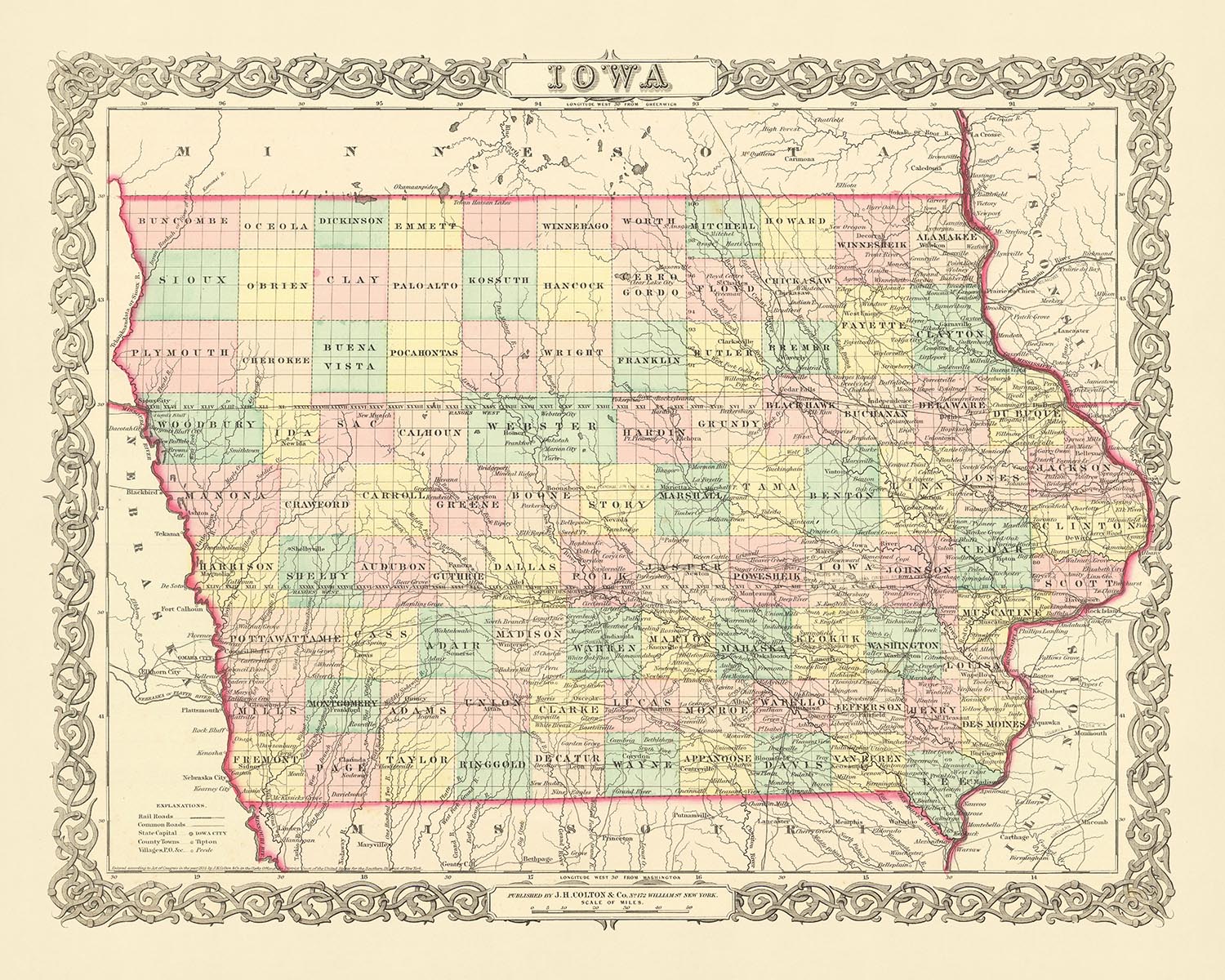 This old map of Iowa by J. H. Colton is more than just a historical artifact. It is a piece of art, a window into the past, and a testament to the skill and dedication of one of America's finest mapmakers. Whether you are a history buff, a collector, or simply someone who appreciates fine craftsmanship, this map is sure to be a treasured addition to your collection.