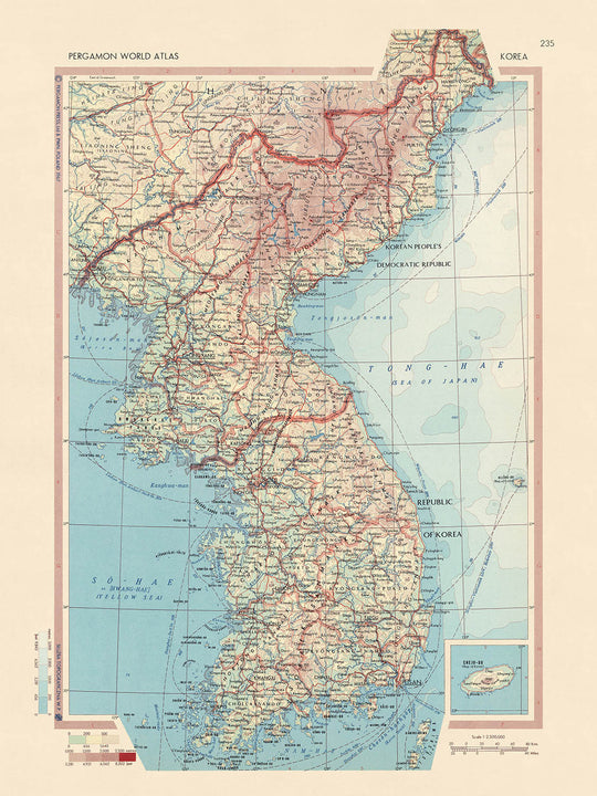 Old Map of North & South Korea, 1967: Seoul, Busan, Jeju Island, Korean War, Taebaek Mountains