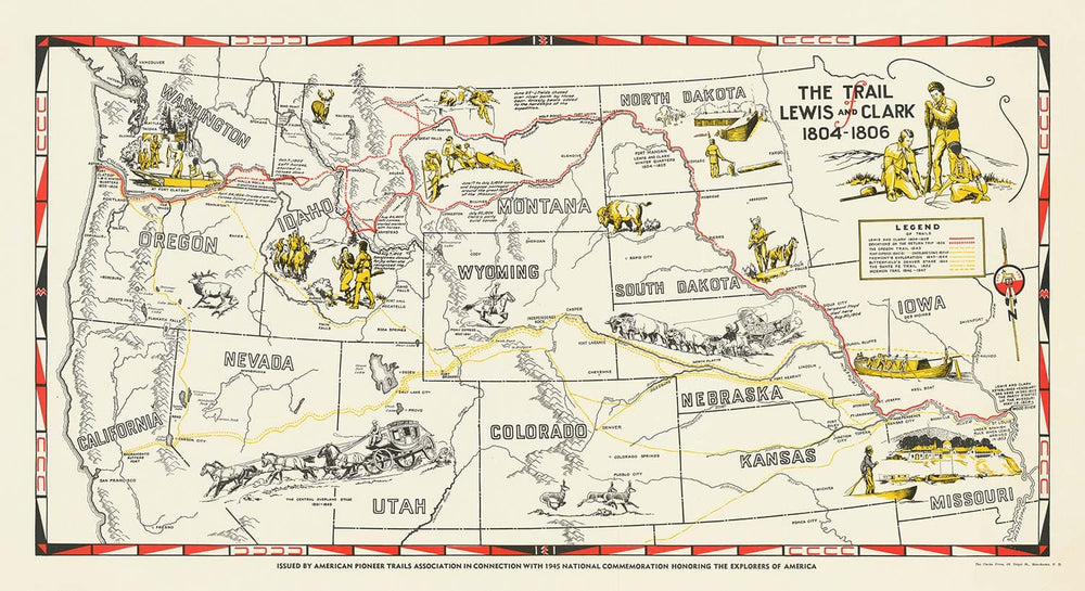 The map also shows the Oregon Trail of 1843, Mormon Trail of 1846-47, the Pony Express of 1860-61, and a few other routes across the country. This map was published in 1945 to honour these early trails forged by explorers.